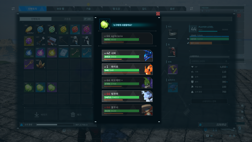 : 아래와 같이 보유하고 있는 팰 리스트가 팝업 된다.