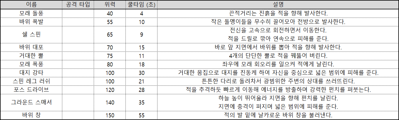 | 땅 | 땅 속성으로 이루어진 액티브 스킬 피격 시 몸에 진흙이 묻거나 스턴을 발생시킬 수 있다. |
