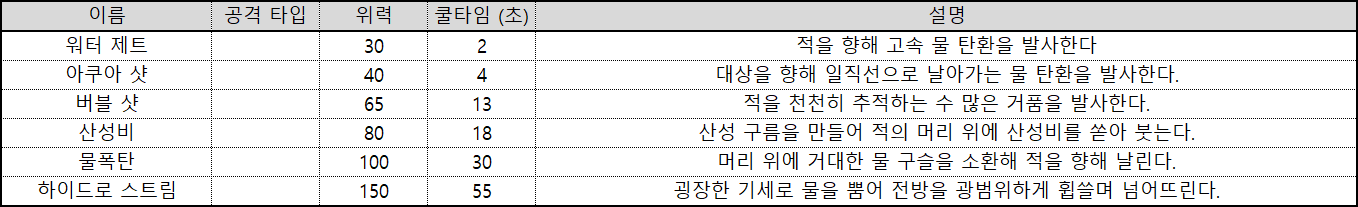 물 속성 관련 액티브 스킬은 아래와 같다.