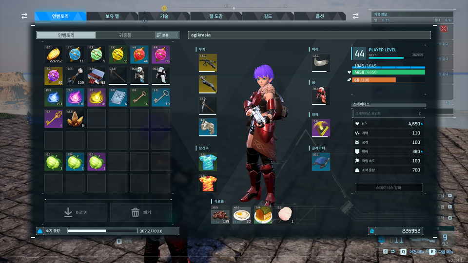 : 아래와 같이 인벤토리 UI로 화면이 전환된다.