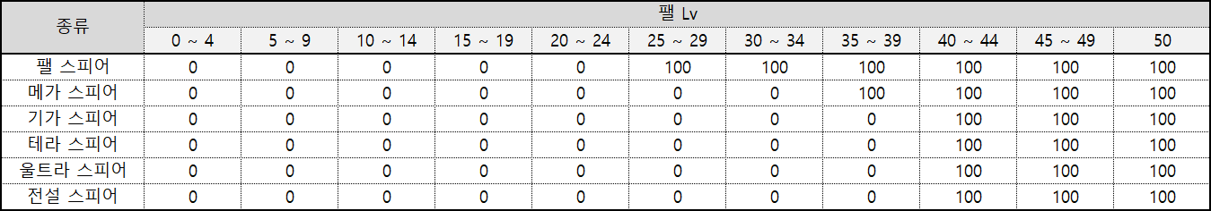 - 스피어 종류와 대상 팰의 Lv에 따른 포획 시도 성공 확률 보정