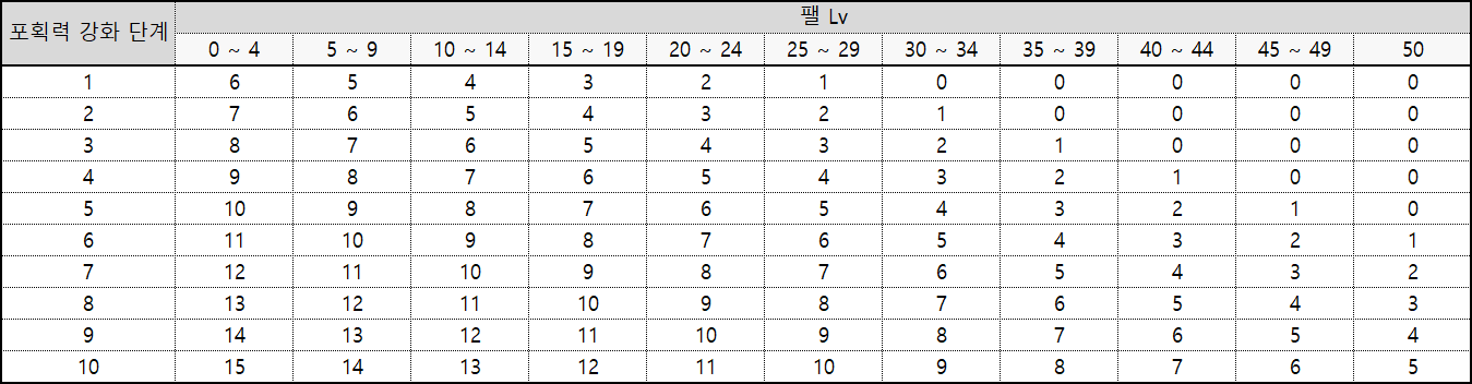 포획력 강화 단계와 대상 팰의 Lv에 따른 포획 확률 보정은 아래와 같다.
