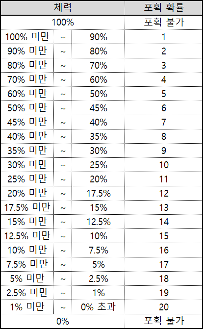 체력에 따른 포획 시도 성공 확률 보정은 아래와 같다.