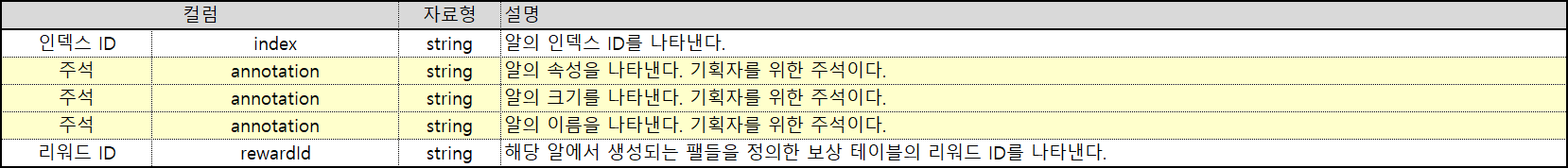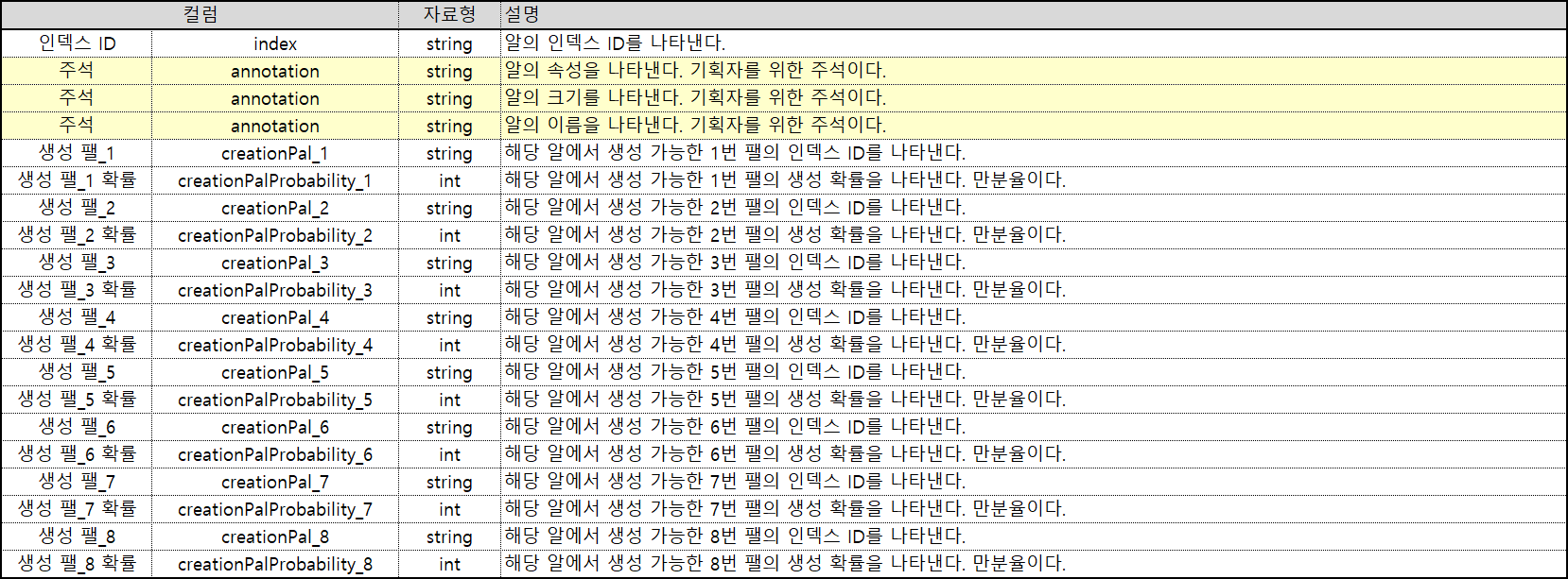 해당 데이터 테이블 구조는 알에 대한 데이터 테이블 구조가 존재한다는 가정하에 부화 시 해당 알에서 생성될 수 있는 팰의 종류와 확률을 명시하여 사용하는 테이블이다.