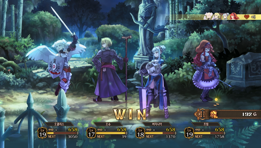 | 승리 | 적 전멸 | 전장에서 적이 소멸된다. 보상으로 경험치와 골드를 획득한다. 특정 부대를 전멸시키면 아이템 획득도 가능하다. 부대원들끼리 호감도도 상승한다. |