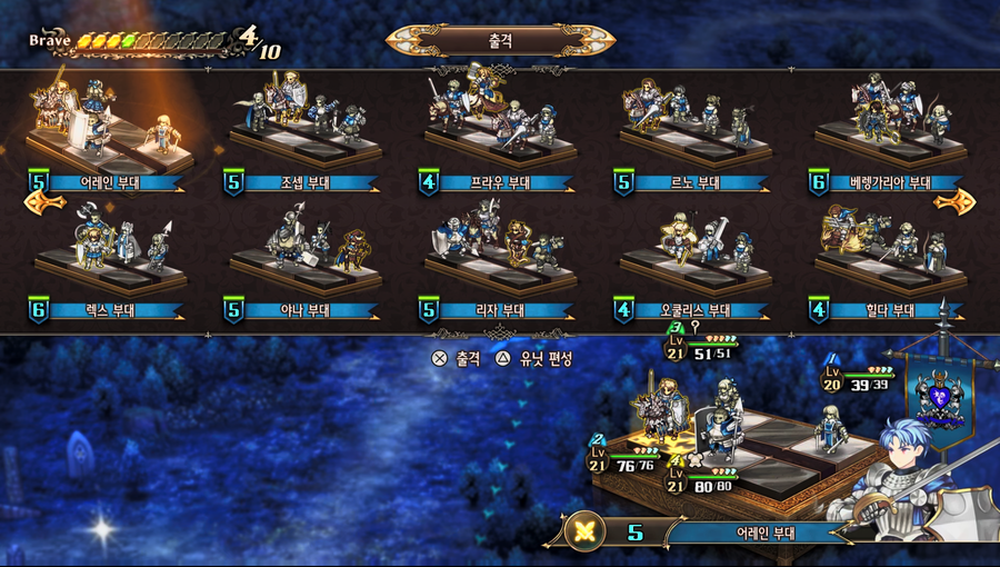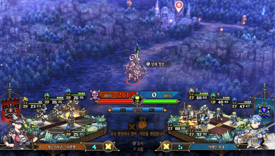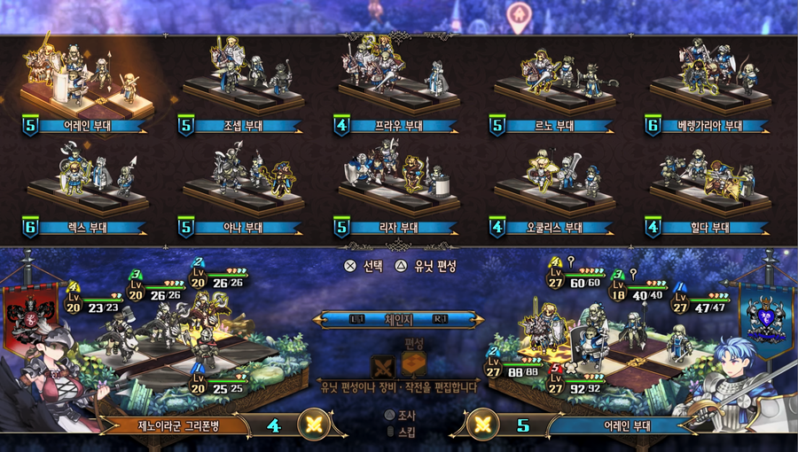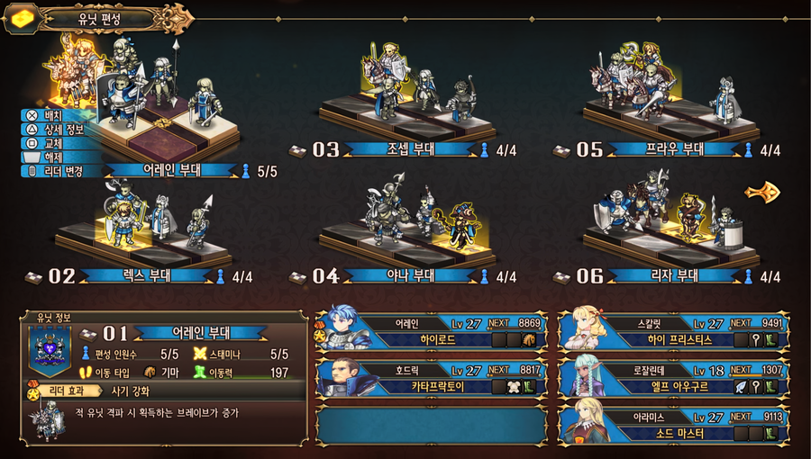 : 부대 선택 후 △를 누르면 아래와 같이 유닛 편성 UI로 화면이 전환된다.