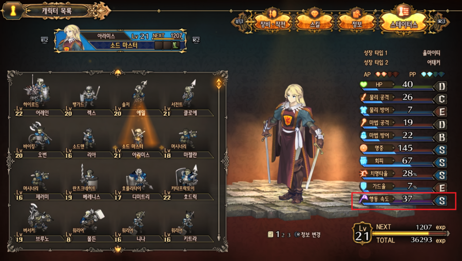 | 행동 속도 | 행동 순서를 결정짓는 스테이터스이다. 수치가 높을수록 먼저 행동을 하게 된다. |