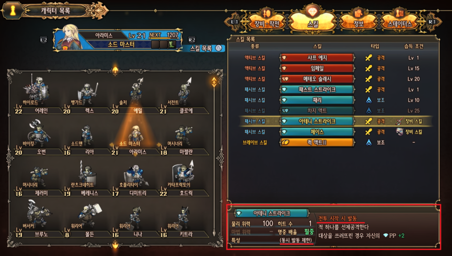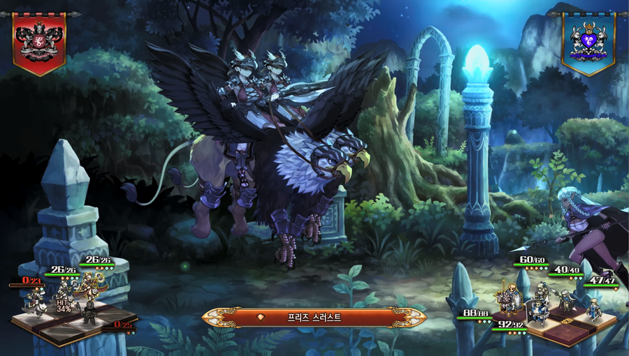 기본적으로 스킬은 가장 가까운 대상을 향해 공격이 들어가는데 사실 제가 예제로 든 상황은 작전을 수립하지 않고도 나이트 계열의 유닛을 적 후열에 있는 힐러 유닛과 동일한 라인에 배치하였어도 해결할 수 있는 부분이었음. 이처럼 특정 상황을 해결할 수 있는 방법이 다수 존재한다는 것이 해당 게임의 매력이라 할 수 있음.