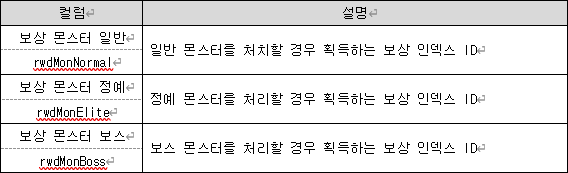 : 해당 몬스터로부터 획득 가능한 보상품은 해당 스테이지 테이블의 리워드 컬럼에 명시된 보상 인덱스 ID를 통해 결정.