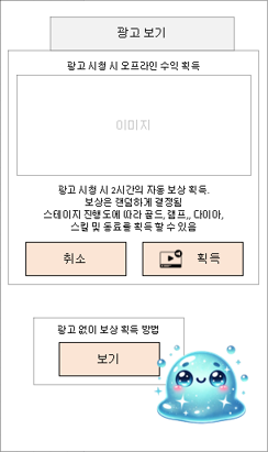 : 터치 시 아래와 같은 광고 보기 팝업이 생성된다. 단, 광고 제거 패키지를 구입한 유저는 광고 보기 팝업 과정이 생략되고 바로 보상 획득이 이루어진다.