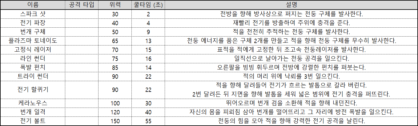 번개 속성 관련 액티브 스킬은 아래와 같다.