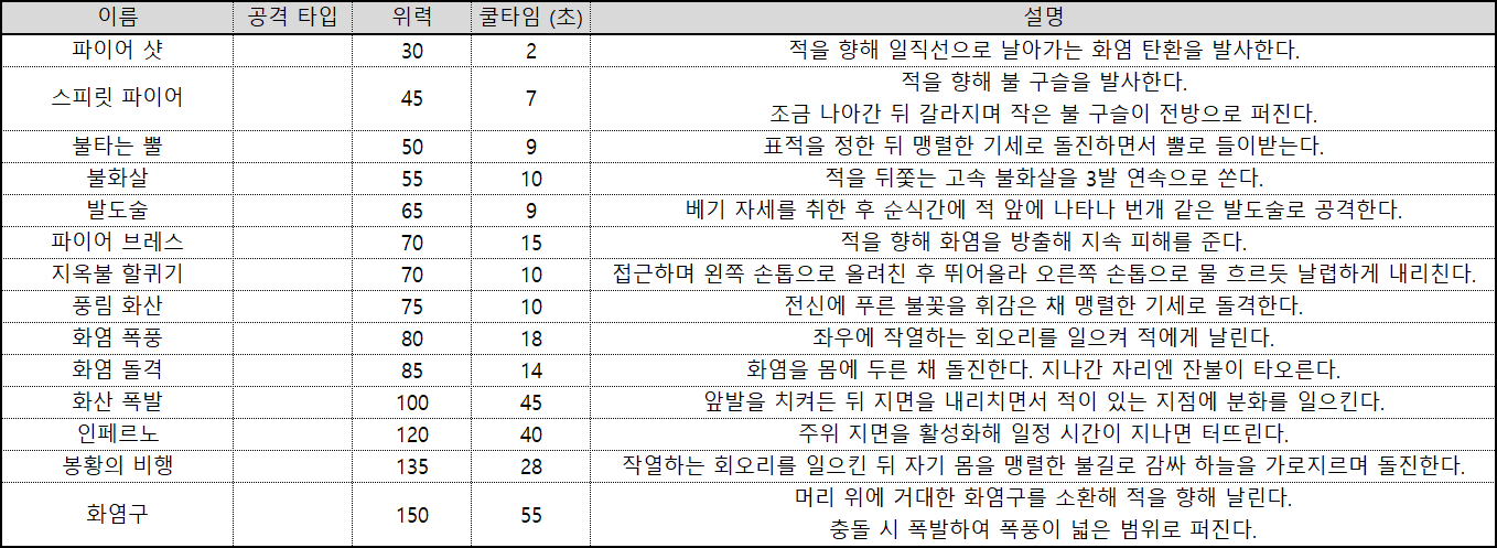 불 속성 관련 액티브 스킬은 아래와 같다.
