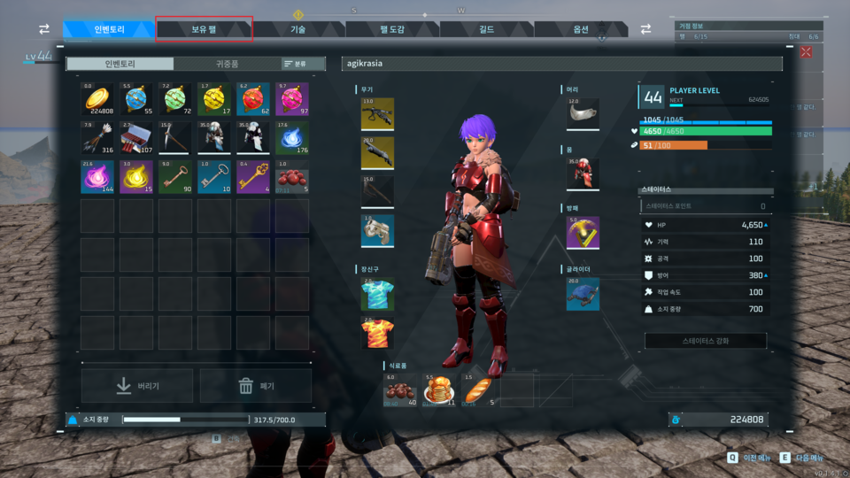 : 아래와 같이 인벤토리 UI로 화면이 전환된다.