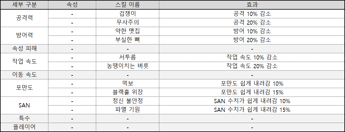 | 어둠 | 어둠 속성으로 이루어진 액티브 스킬 피격 시 중독되거나 암흑으로 뒤덮일 수 있다. |