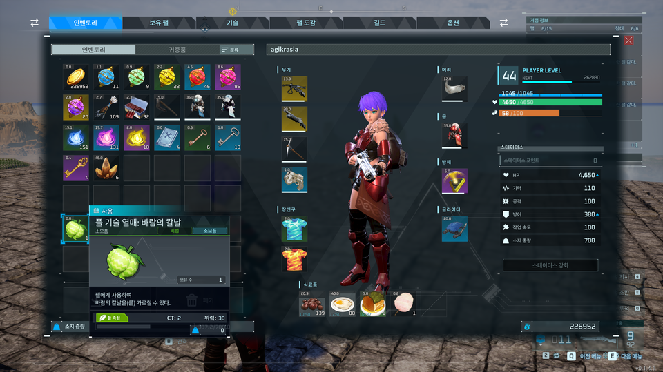 : 해당 화면은 기술 열매를 왼쪽 마우스 버튼으로 클릭하여 정보창이 팝업 된 상황이다.