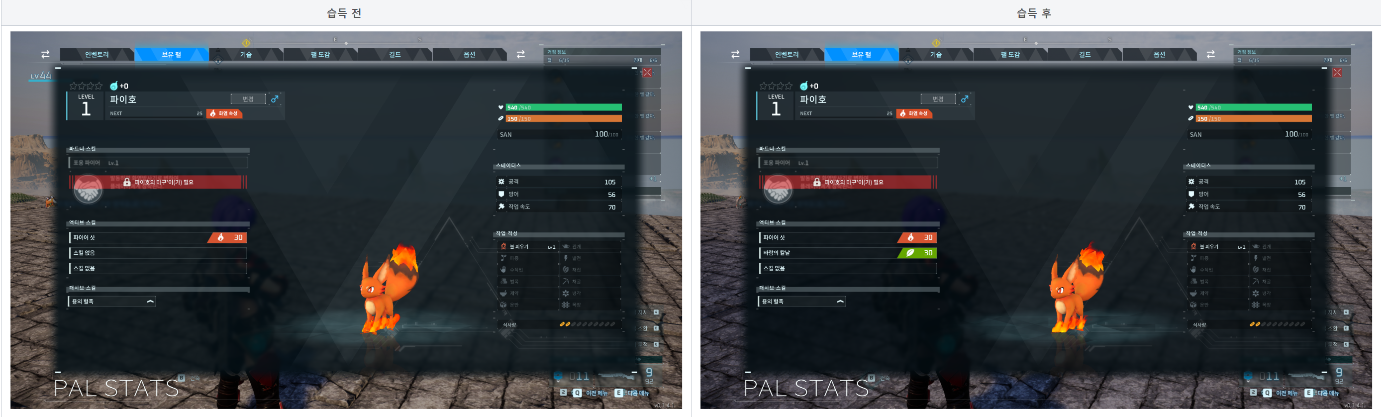 : 전용 스킬은 해당 팰 생성 시, 100% 습득한 상태로 나타난다.
